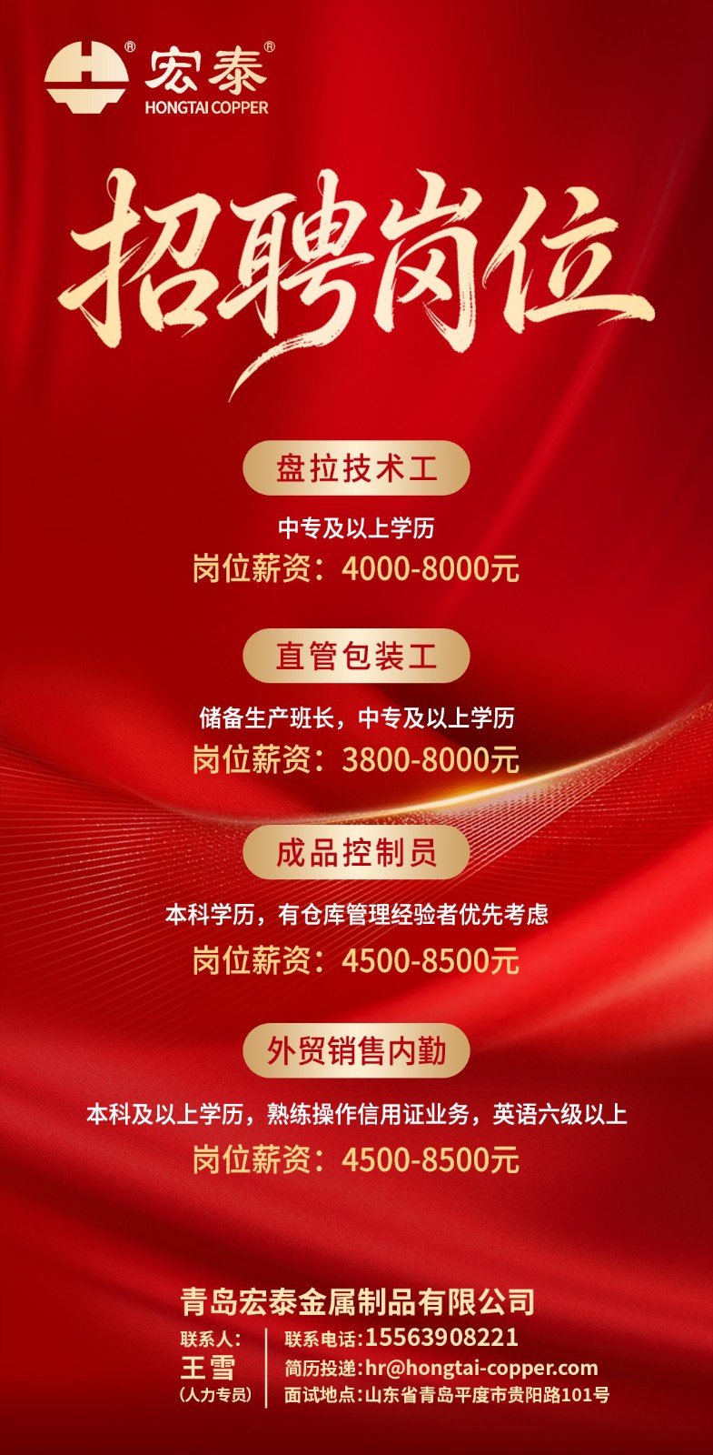 宏泰自1993年開始一直專注于紫銅管系列產品的研發與生產,宏泰商標也榮獲“中國馳名商標”的殊榮,企業年銷售達三十多億元,展現出強勁的發展實力。作為平度本土企業,宏泰在三十多年的發展歷程中,積淀了深厚的企業文化底蘊。公司新建“智能化綠色制造高精度紫銅管生產線”,為滿足發展需求,補充優秀賢能人士,需要招聘以下崗位。