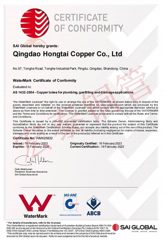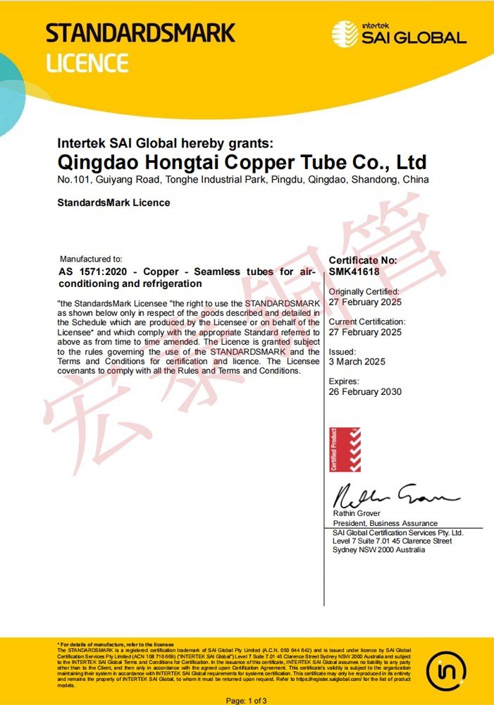 宏泰銅管產品順利通過AS 1571無縫制冷用銅管標準認證【證書編號:SMK41618】和AS 1432給排水銅管標準認證【證書編號:WMK26832】。