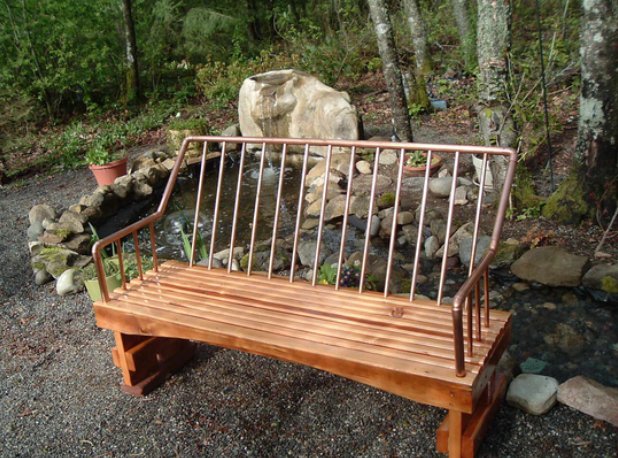 銅管桌子說完了,再說說椅子,看到上圖,各位讀者未免懷疑這板凳的穩定性,如果你親自用手彎一下外徑35mm,壁厚且2mm的銅管,相信你再也不會擔心這板凳的承重能力,銅管可按照自己的想法切割,但是事先得設計好圖紙,用銅管設計最重要的是要考慮連接處的穩定性,以銀焊條焊接可以很好的保證連接處的穩定性,以上的板凳如果讀者對靠背的牢固程度擔憂,可在椅面與椅背之間加一根支撐,利用三角形的穩定性,也可在椅面與椅背之見做一個矩形的扶手,實用也不影響美觀。