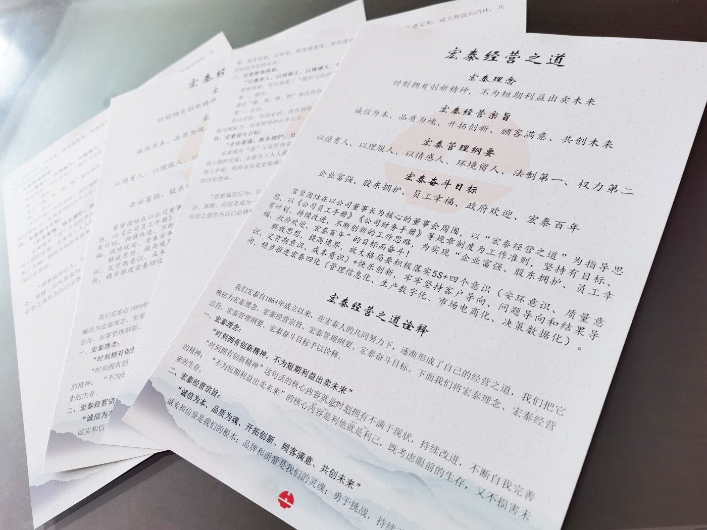 奮進的道路上,李福鵬一直秉承“宏泰經營之道”的指導思想。堅持“時刻擁有創(chuàng)新精神,不為短期利益出賣未來”的宏泰理念,本著利己不損人,堅持利他才能利己,合作才能雙贏的管理思維,積極落實5S + 四個意識 + 快樂創(chuàng)新;牢牢堅持客戶導向、問題導向和結果導向;重點聚焦法制第一和精細化思維工作方式,圍繞宏泰經營宗旨和管理綱要的中心思想,逐漸使宏泰人形成人心思進、團結和諧、共促發(fā)展的良好氛圍,在穩(wěn)步推進宏泰四化的基礎上,堅持穩(wěn)走四條道路:堅持宏泰經營之道厚德載物,走員工幸福的道路;堅持把合規(guī)放首位,走穩(wěn)健經營的道路;堅持管理信息化和生產數字化直至智能化的兩化深度融合,走分工專業(yè)化道路;堅持KPI考核,走績效管理的道路。
